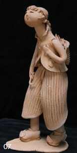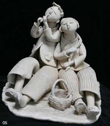 郭:因为我这个做法不像咱们学的那种做法,有一点像面人的做法,我有时候是从里边往外边做,形体、衣服、脸都是从里边往外面做,外面的肌理,手不能碰。你看衣服的这种感觉,我从里面往外边拱着做出来的,脸骨骼也是从里边往外做的。总体的构思以后,胳膊、腿等分件组装的,组装后比例不对,就重新做,不协调,再重做。有时一天也做不好一个人物。做顺手了可能半小时就做出来了。你看我的作品看不出多少时间做的,看起来都挺快,实际并非都顺手。我做陶雕需一气呵成,有一点像中国画小写意,我想追求那种使观众看起来轻松的感觉与效果。不能断气,实际上跟书法一样一笔下来那个感觉。一笔下来不能再改再描。